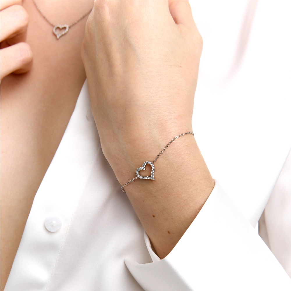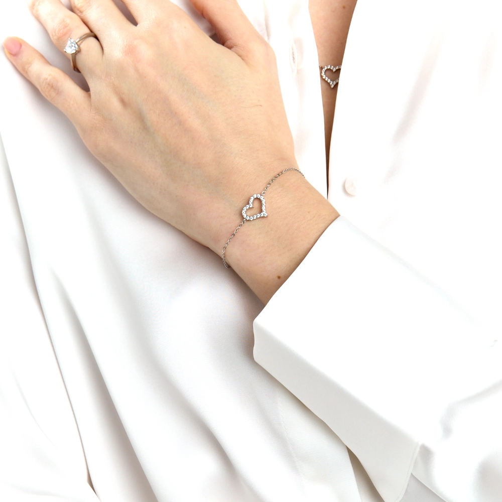 The delicate Amoria bracelet is a symbol of subtle elegance and timeless love. Made of silver and decorated with a heart studded with sparkling moissanites, it delights with its lightness and romantic character. Each stone is precisely set in the frame, creating a dazzling effect that beautifully emphasizes femininity and charm.